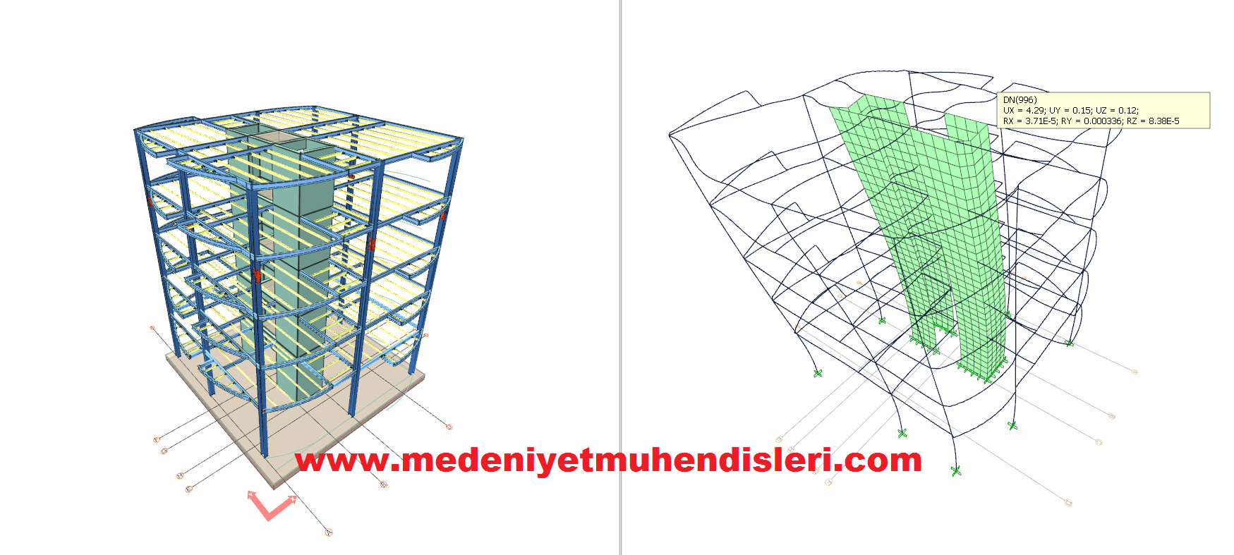 Yapıya bir hareket verildiğinde, mesela deprem gibi bir yer hareketi verildiğinde yapı aynı doğal halindeki gibi titreşir.Yani doğal halinde 1 mm olan deplasman yer hareketi aşamasında 10 mm, 2 mm olan deplasman 20 mm olur.Ama mod şekilleri değişmez.Deprem anında yapı yine aynı mod şekillerini alır.Herhangi bir kattaki deplasman(mod şeklinin deplasmanı) o katta oluşan kuvvete göre değişir.Kabaca yazarsak,ilgili sistem için 1 mm lik deplasmanı 100 tonluk bir kuvvet gerçekleştiriyorsa, 2 mm bir deplasman olmuşsa(yer hareketinden dolayı), demekki benim yapımdaki kesme kuvvetinin değeri(kat kesme kuvveti) 200 ton dur.Bu mantıkla deprem anındaki mod şekillerine göre rahatlıkla kesme kuvvetlerini bulmamız mümkündür.